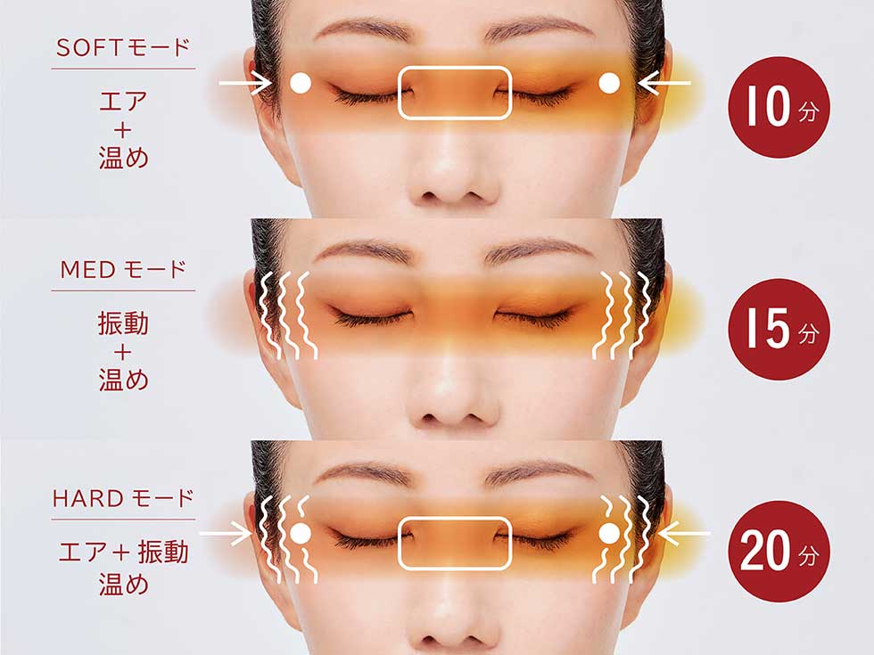 ここちよい「温熱」+ほどよいエアの「空気圧」+こめかみにやさしい「振動」でリフレッシュ。