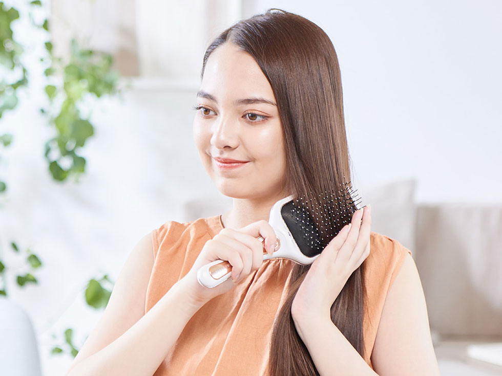頭皮から髪を一気に梳かさないように、まずは毛先のもつれを軽くとり、それから頭皮中心にブラシエステします。
