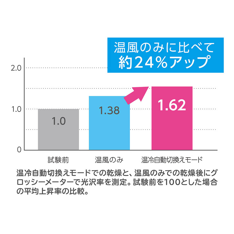 温風と冷風が一定の間隔で切換わることで、過乾燥による熱ダメージを抑えながら、ツヤ感とまとまりのある髪に仕上げます。