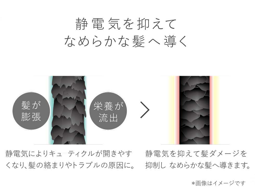 マイナスイオンだけでは中和しきれない髪全体の静電気を除去し、まとまりある髪へ導きます。