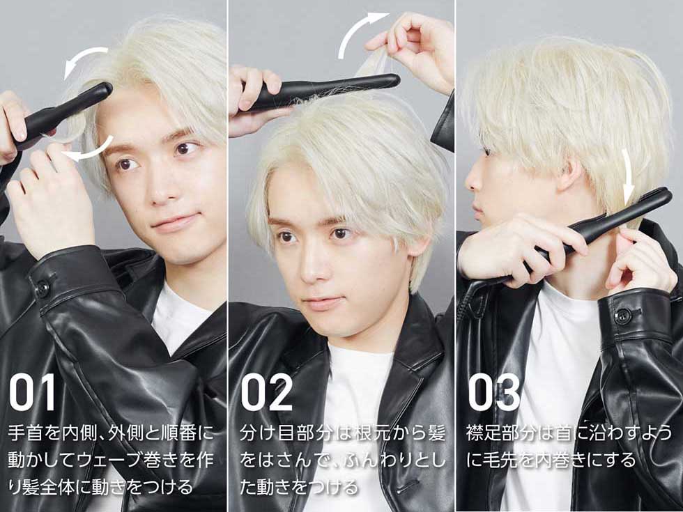 Step1) 手首を内側、外側と順番に動かしてウェーブ巻きをつくり、髪全体に動きをつける