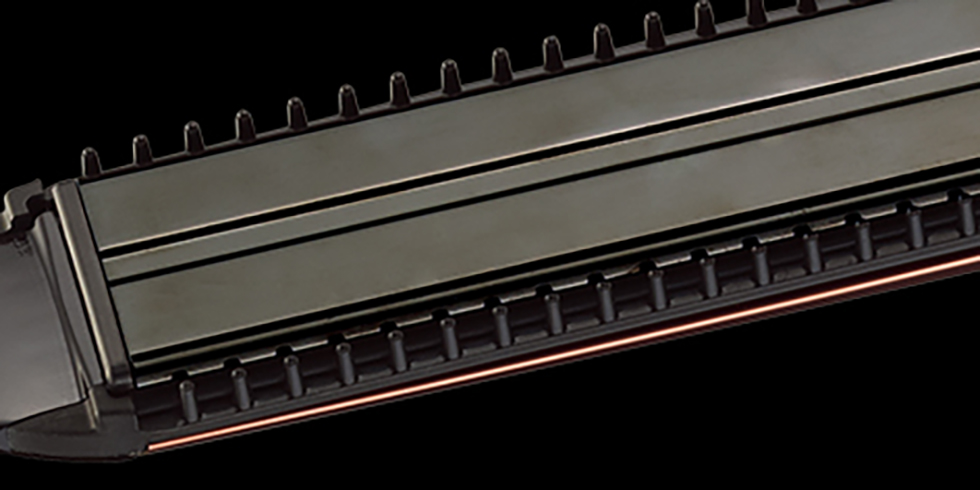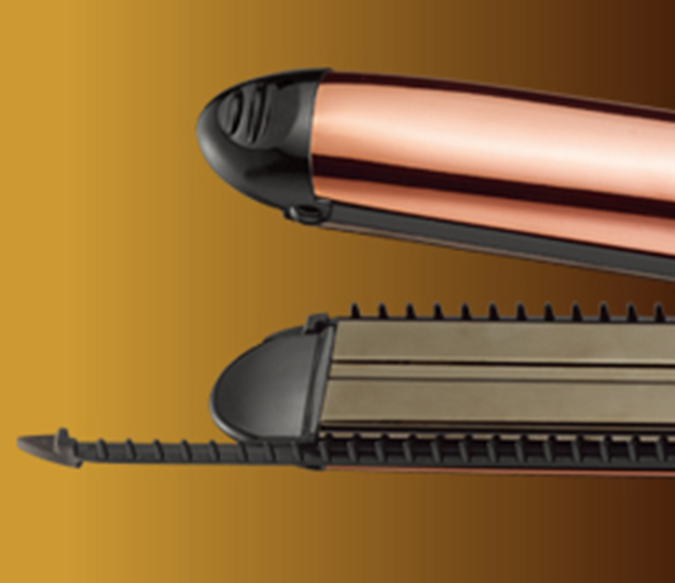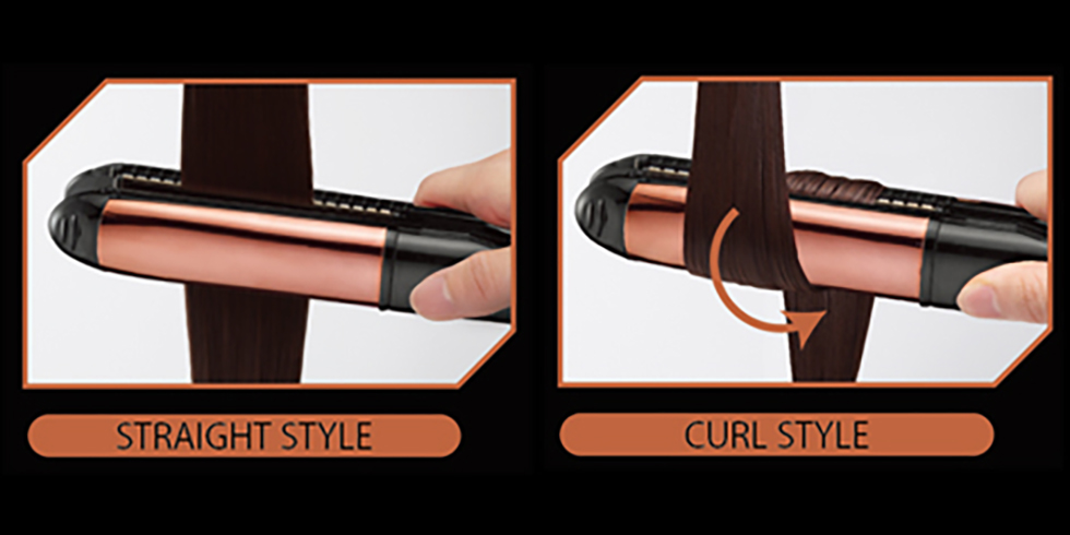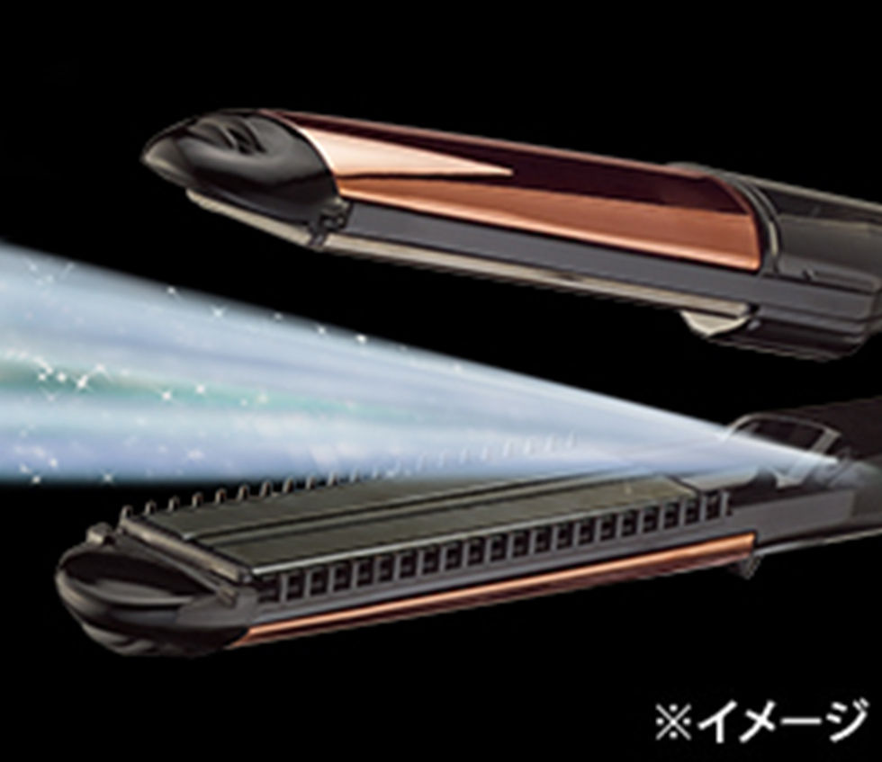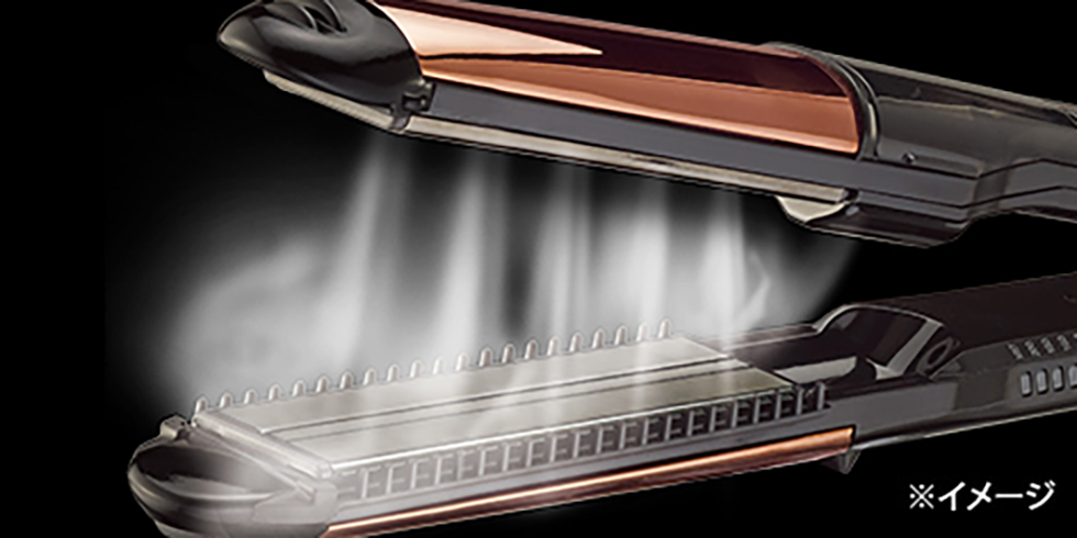<左:ストレート> 長さ110mmのロングプレートで髪をしっかりと挟み、超音波ミストで潤いながらスタイリング。