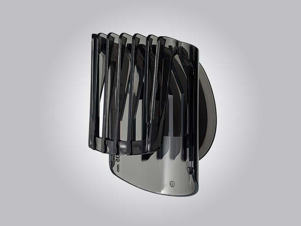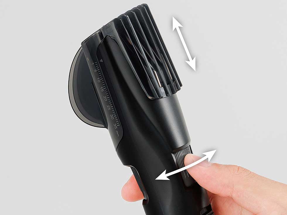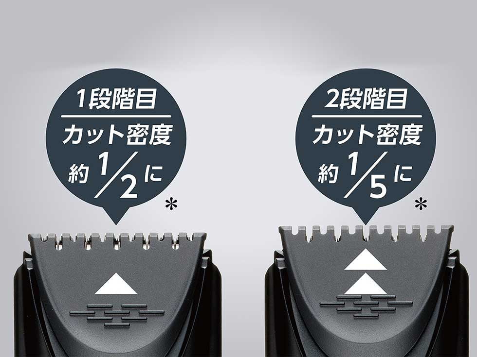 仕上げの毛量調整や段差ぼかしをしたいときに、スキ刈りコームの使用がおすすめです。 スキ刈りコームを上にスライドさせることで2段階の調整ができます。