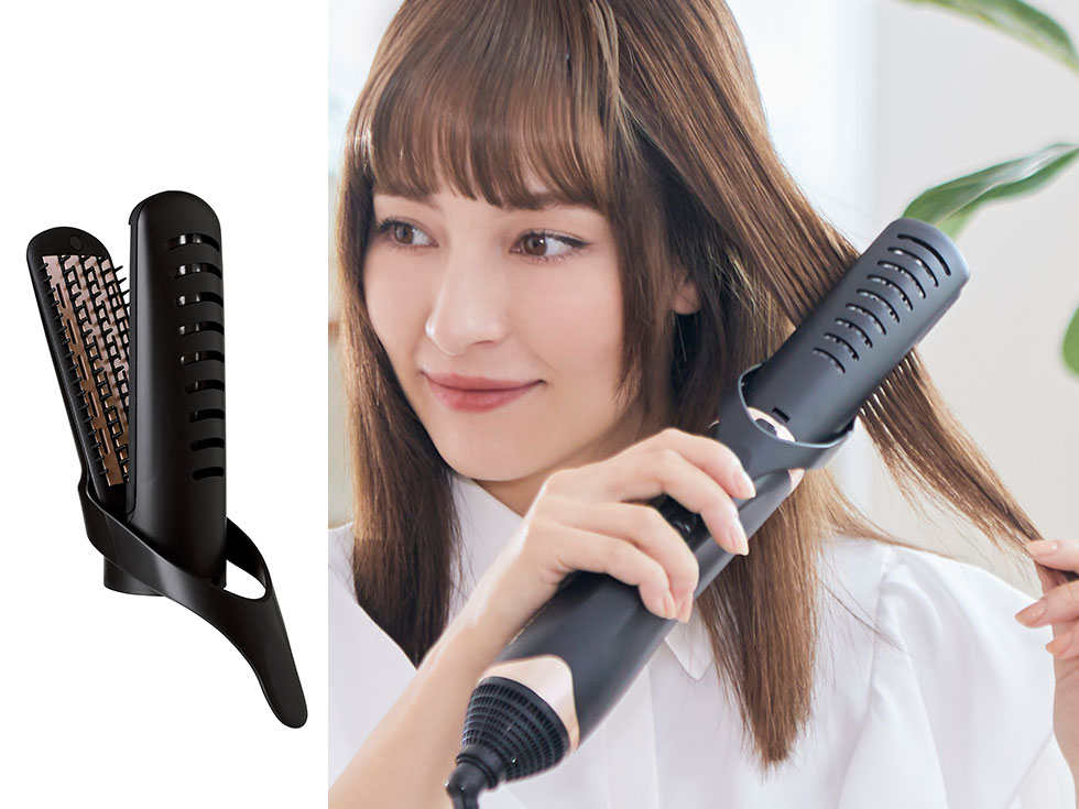 広がりを抑えて毛先までまとまりのある髪に。金属プレートで挟み込むので髪の毛のクセをしっかり伸ばしてセットします。