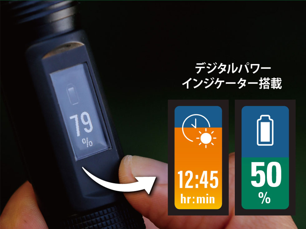 稼働時間とバッテリー残量をデジタルでわかりやすく表示します。