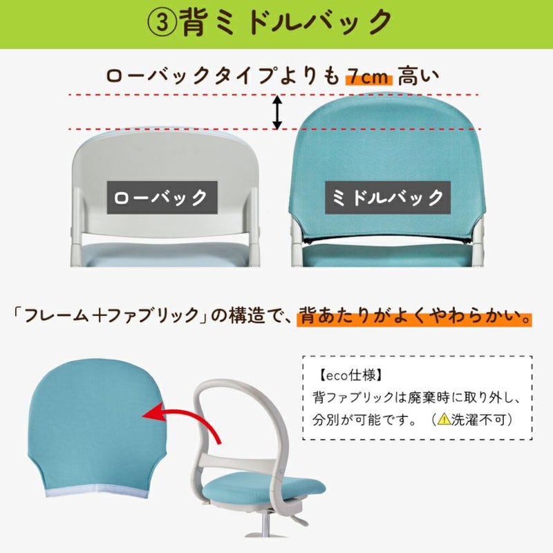 ファブリックタイプは、PVCレザータイプよりも7cm高いミドルバックの背もたれです。