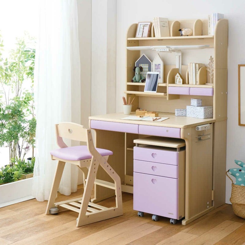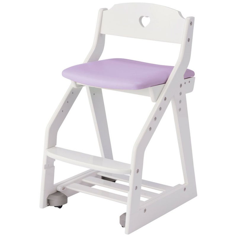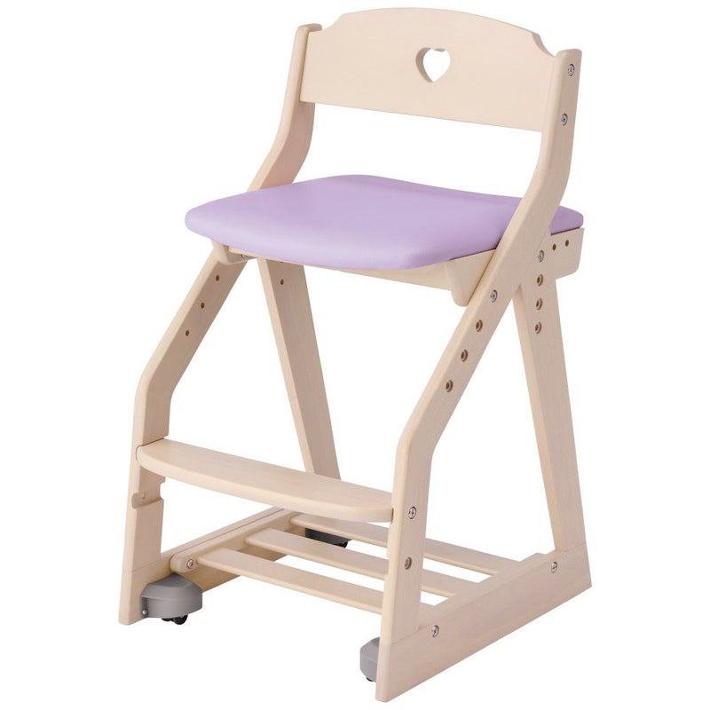 背もたれのハートのくりぬきがかわいいラブリーチェアです。木部のカラ-は木目のあるWW色(座面/ライトピンク・ライトブルー・パープル)と光沢感のあるPW色(座面/ライトピンク・パープル)です。