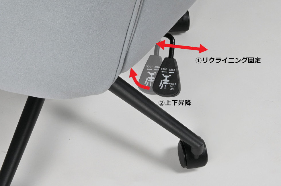 座って右側のレバー(②)で座面高を420~515㎜と調節が可能です。