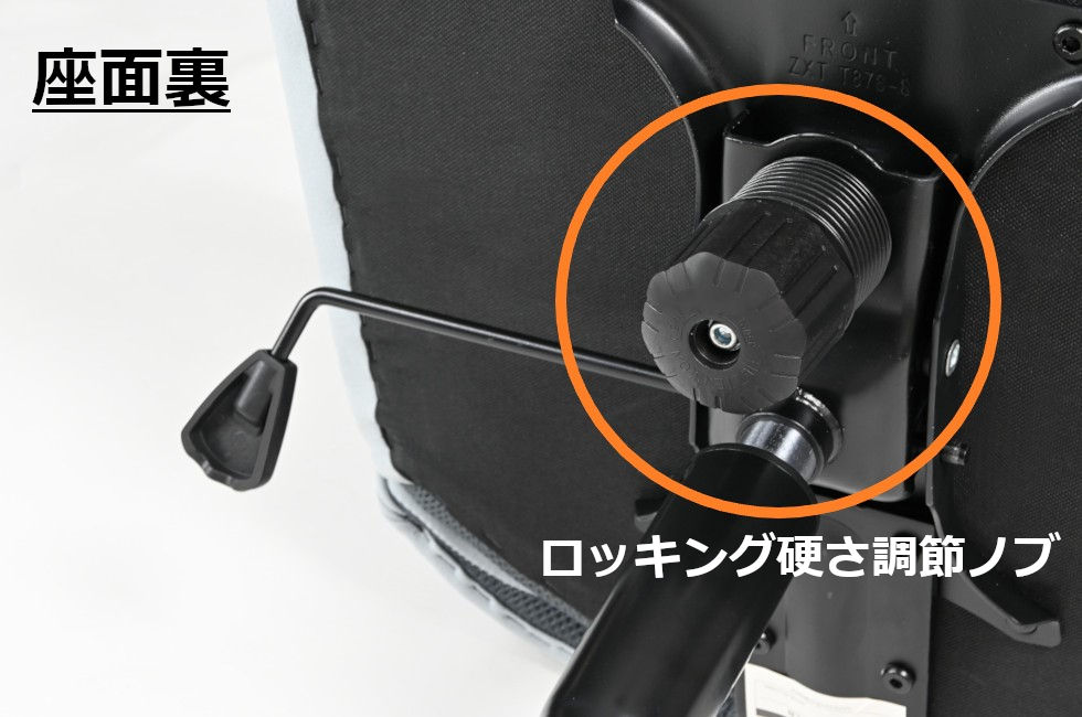 座面裏のロッキング硬さ調節ノブを時計回りに回すとロッキングの固さが強くなり、反時計回りに回すと弱くなります。
