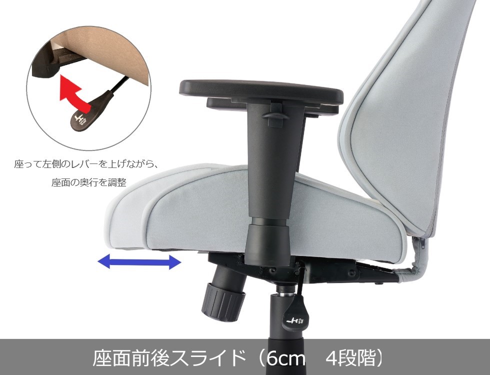 座って左側のレバーを上げながら座面の奥行を4段階(6cm)調整可能です。