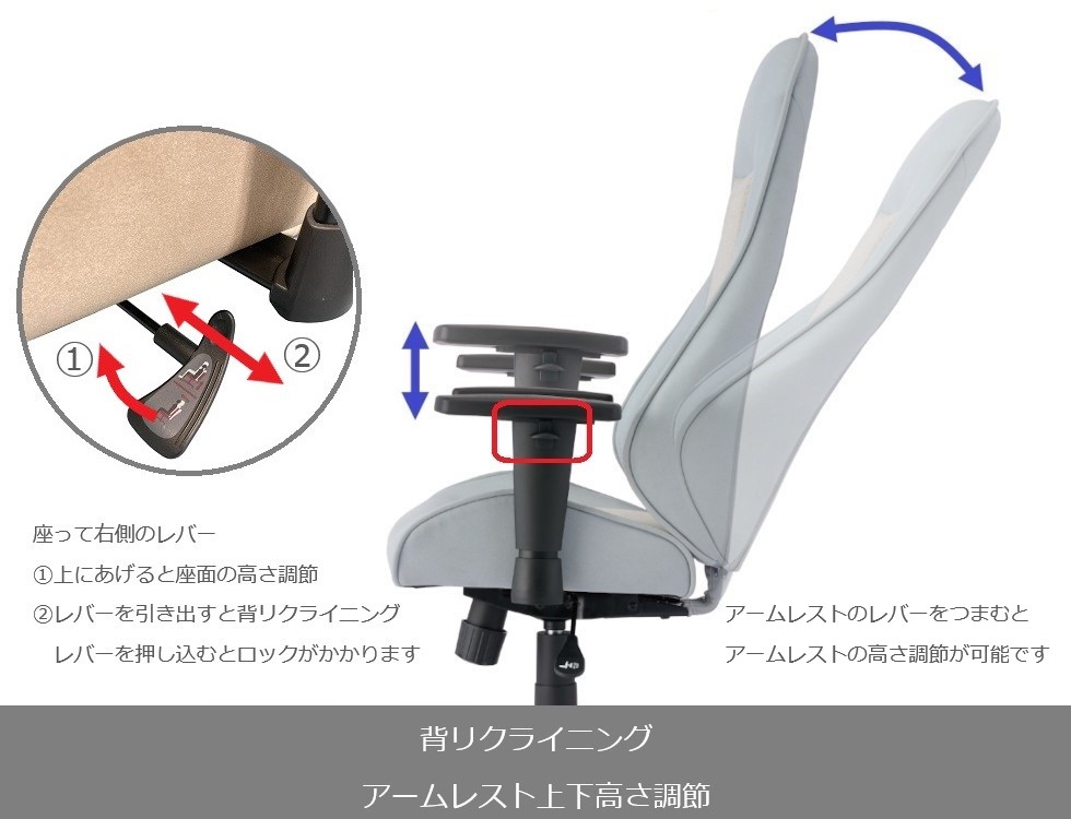 アームレストはアームレストのレバーをつまみながら上下高さ調整が可能です。
