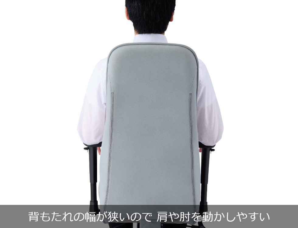 背もたれの幅が狭いスリム形状。肩や肘を動かしても邪魔にならず、可動範囲が広いので適度に身体を動かすことができ、長時間座っていても疲れにくいです。