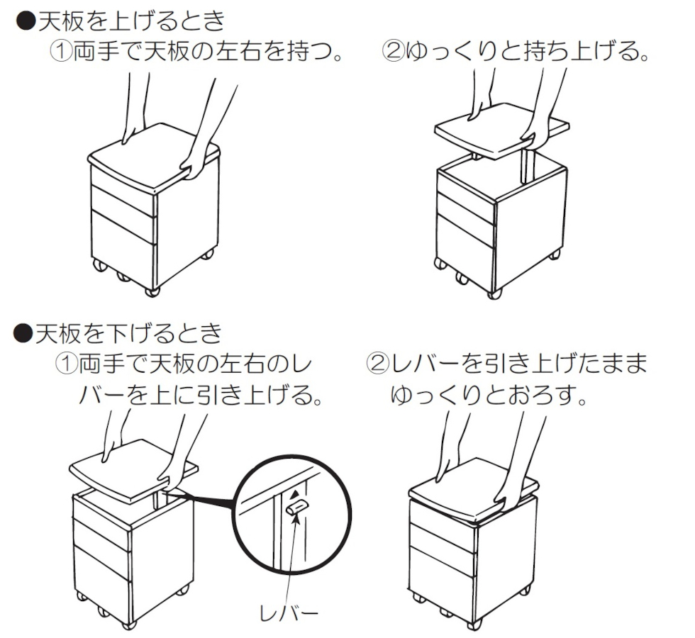 下げる際は、左右のレバーを上に引き上げながらゆっくりとおろしてください。
