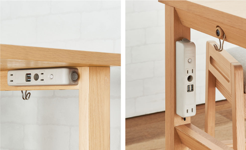 デスクに付属のUSBポート付きコンセントボックスは、天板下内側もしくは前脚内側に取り付け可能です。
