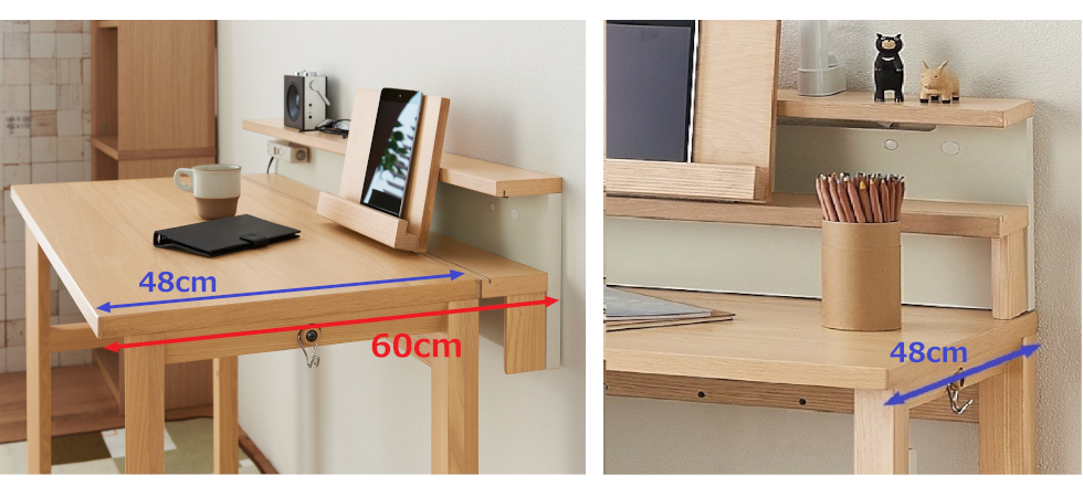 別売のデスクシェルフを拡張天板として利用すると、デスクの奥行を60cmまで広げることができます(写真左)。