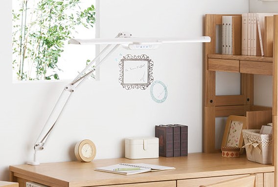 光の質を考えたLEDライト。モードに応じて光色切替(順送り)機能付きです。アーム式なので、セード位置を自在に動かせます。