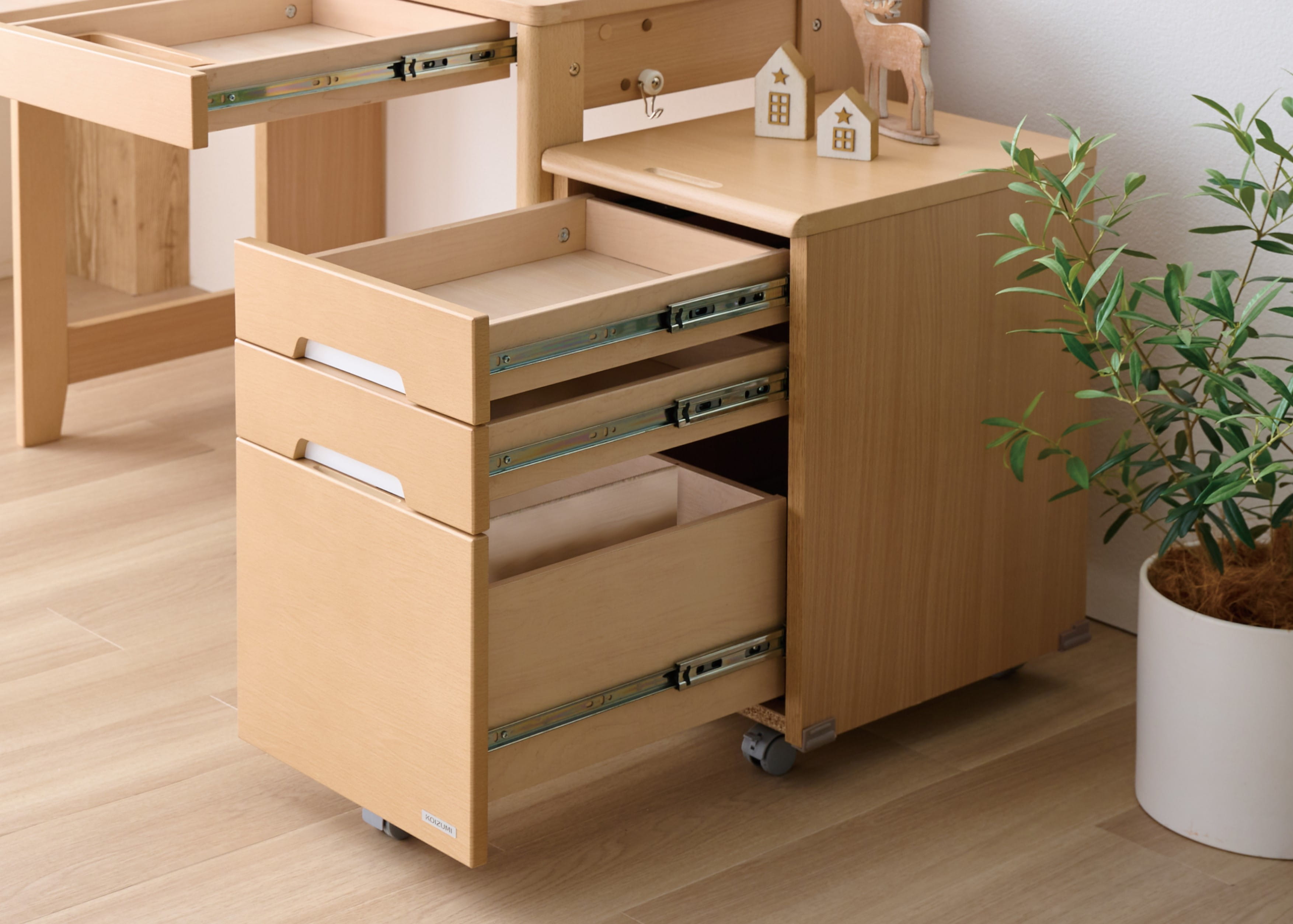 ・ワゴンの引き出しは全段フルオープンレールを採用。 最後まで引き出せるので、奥のものも簡単に取り出せます。