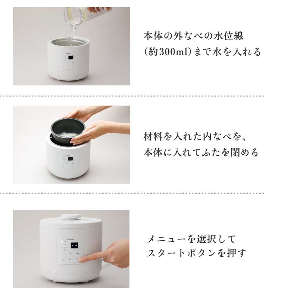 ※上記の調理完了までの時間は調理開始から保温になるまでの目安時間です(室温および水温25℃の場合)室温、水温、水加減などにより、調理会完了までの時間が変わります。