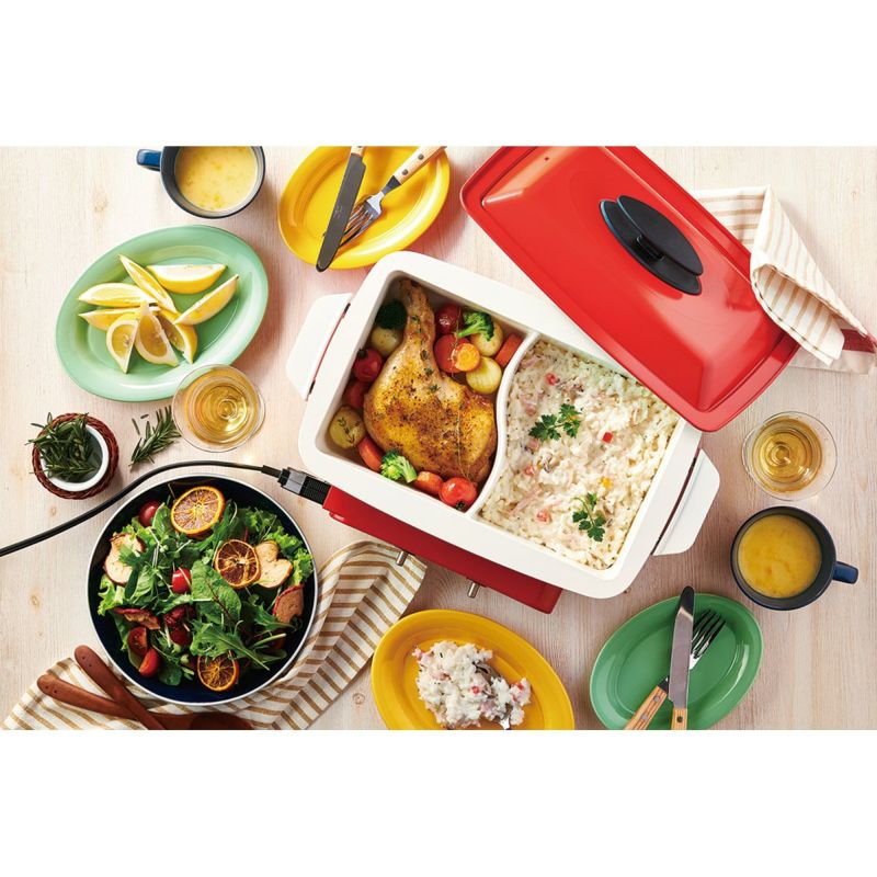 セパレート式の2口の熱源を搭載。左右それぞれ温度調節できるので、必要な加熱温度の違う2つのメニューの同時調理が可能です。