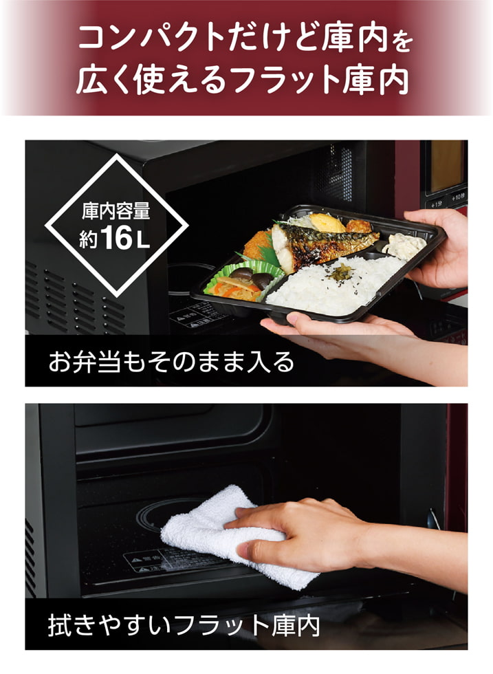 ターンテーブルでなく、フラット庫内なので庫内のスペースを効率的に使え、お弁当の容器を入れ替えずに、そのまま温めなおすことができます。