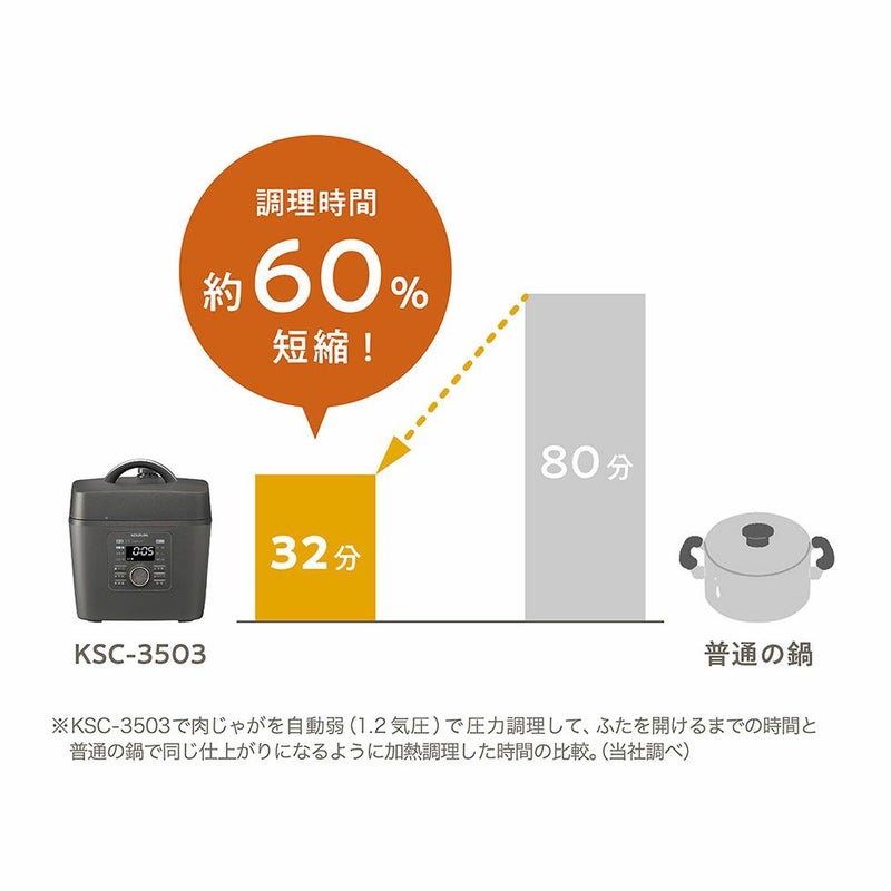 ※KSC-3503で肉じゃがを自動弱(1.2気圧)で圧力調理して、ふたを開けるまでの時間と普通の鍋で同じ仕上がりになるように加熱調理した時間の比較。(当社調べ)