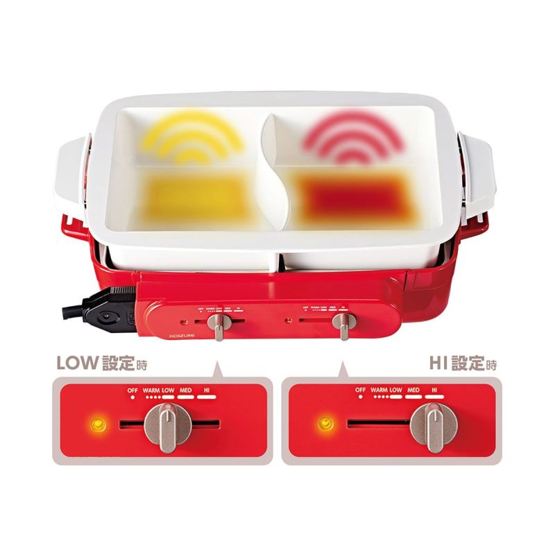 セパレート式の2口の熱源を搭載。左右それぞれ温度調節できるので、必要な加熱温度の違う2つのメニューの同時調理が可能です。
