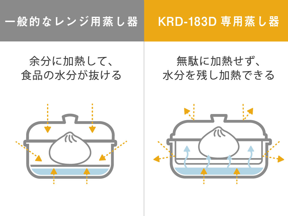 また、付属品の蒸し器は当製品(KRD-183D)専用です。他の電子レンジや直火等では使用できません。