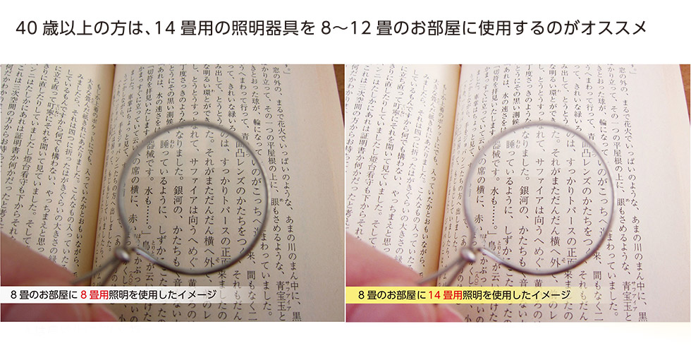 カタログの畳数表記は20歳を基準に必要な明るさを記載しております。一般的に40歳以上の方は、若年層の約1.5倍~2倍の明るさが理想とされています。