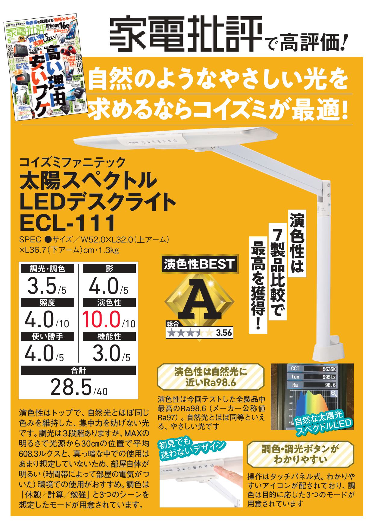 家電批評2025年5月号【高性能LEDデスクライト7選】に、KOIZUMIの太陽光スペクトルLEDデスクライト「ECL⁻111」が選ばれました!