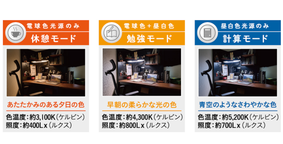 「計算モード」:子どもの脳を総合的に働かすのに適した青みがかった白い光です。計算などの勉強に向いています。