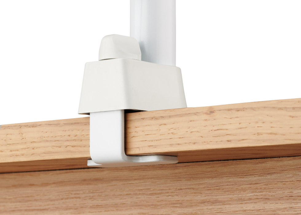 取付天板に挟み、上部の取付つまみをまわすだけの簡単取り付け。支柱がまっすぐなので、操作もしやすく自由に動かせます。