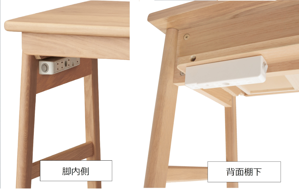 コンセントボックスは側脚上板の内側の左右、もしくは背面棚下の左右のうち、いずれか1箇所を選んで取り付けていただけます。