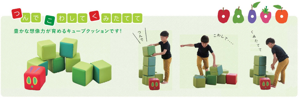 つんで、こわして、くみたてて、豊かな想像力が育めるキューブクッションです。
