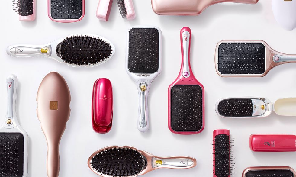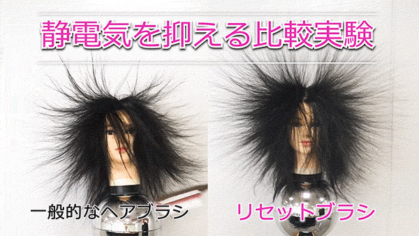 左が一般的なヘアブラシ、右がリセットブラシ。リセットブラシは静電気を抑え、素早く髪がまとまります。