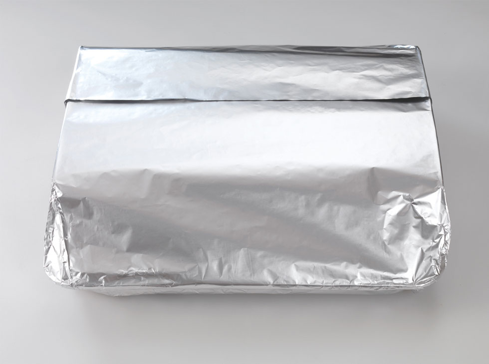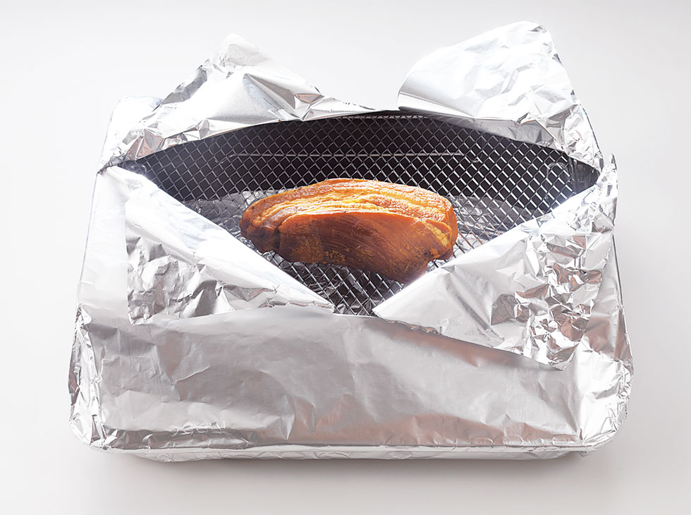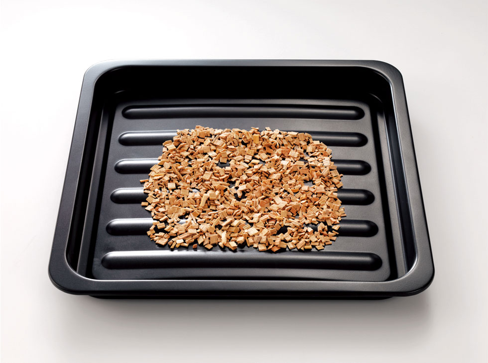 1.くんせいチップを量り、角皿に広げ、アルミホイルを乗せる。