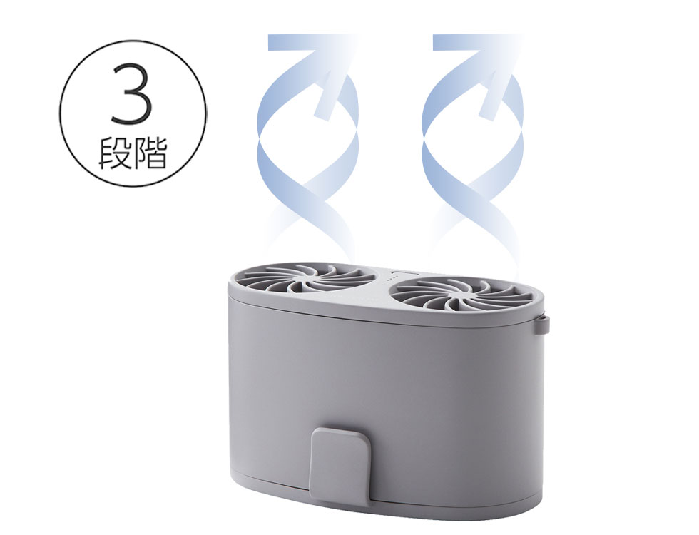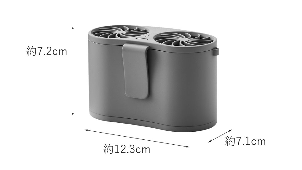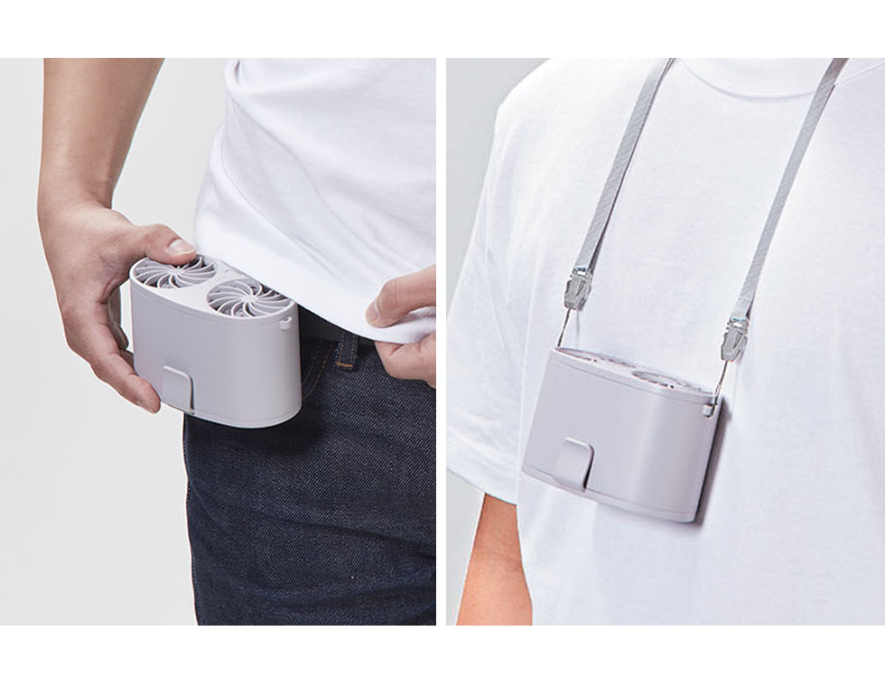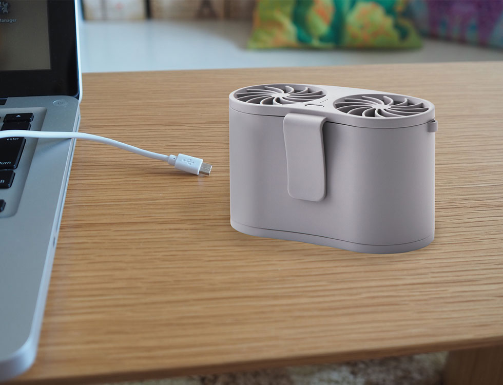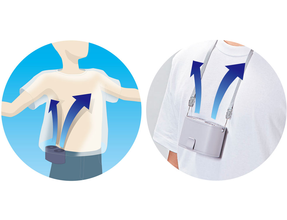 外側のシャツフックで、Tシャツなどを挟んで服の内側に送風できます。