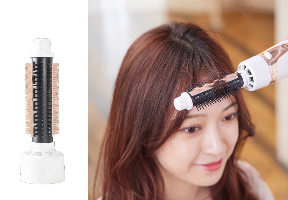 ブラシの形状の丸みを利用し、巻き込んだら温風OFFにします、余熱でクセ付けをし、立体感あるカールに仕上がります。