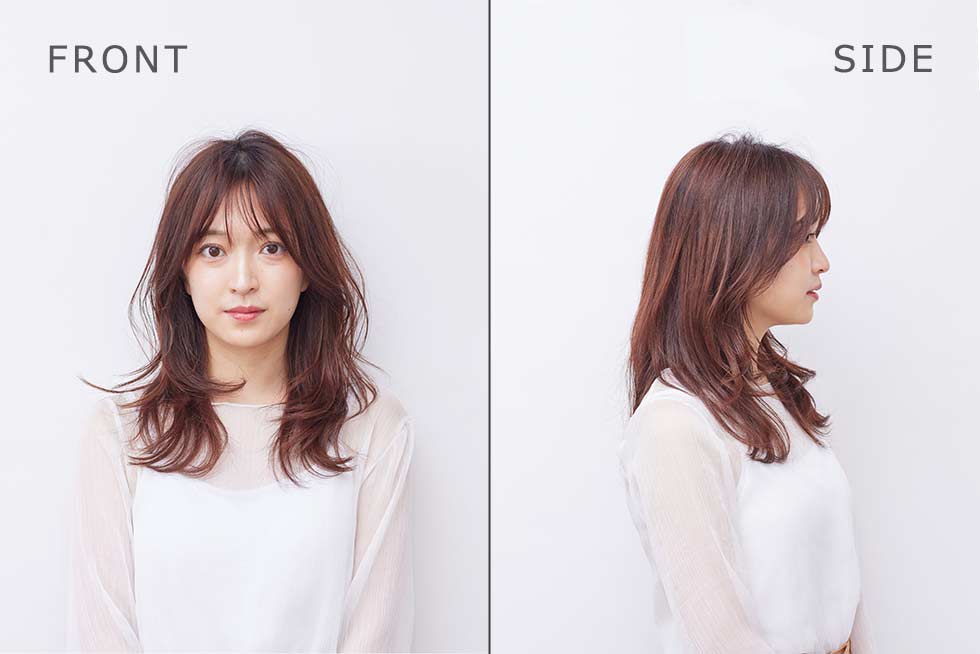 ロールキャッチブラシでカール感と立ち上がりを作り、風量LOWで温風を当て、余熱で冷ましながら抜いていきます。