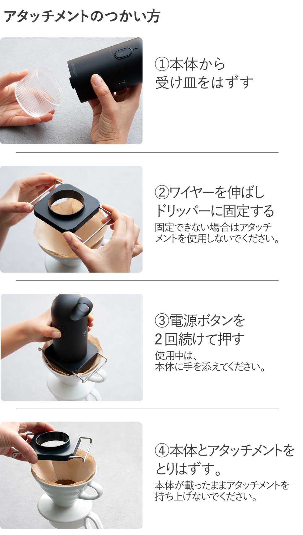※ドリッパーにうまく固定できず不安定になる場合は、ドリッパーアタッチメントを使用しないでください。