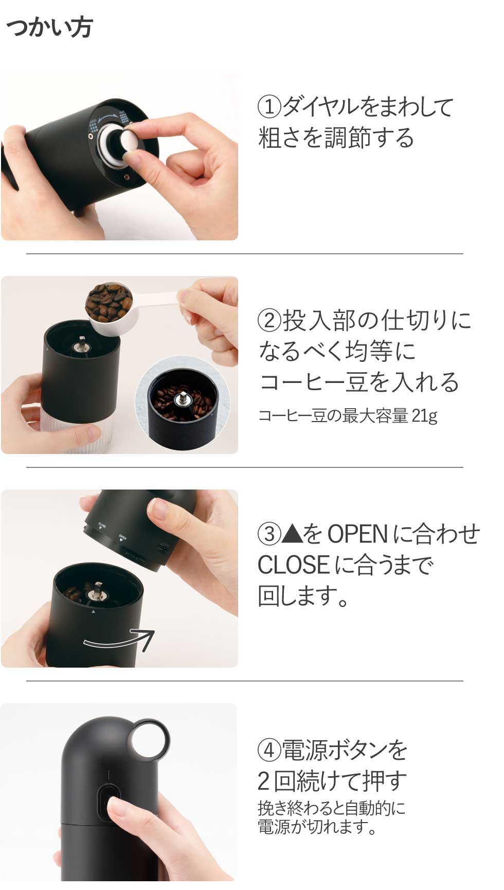 ・豆の量や入れ方によっては1回の動作で挽ききれない場合があります。その際はもう一度作動させてください。