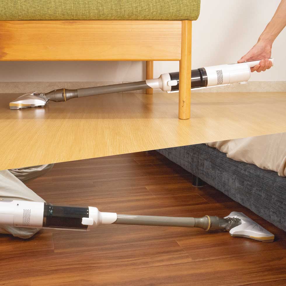 ベッドやソファの下もスムーズにお掃除。回転式のローラーブラシなど駆動部がないためヘッドの薄さ・軽さを追求しました。