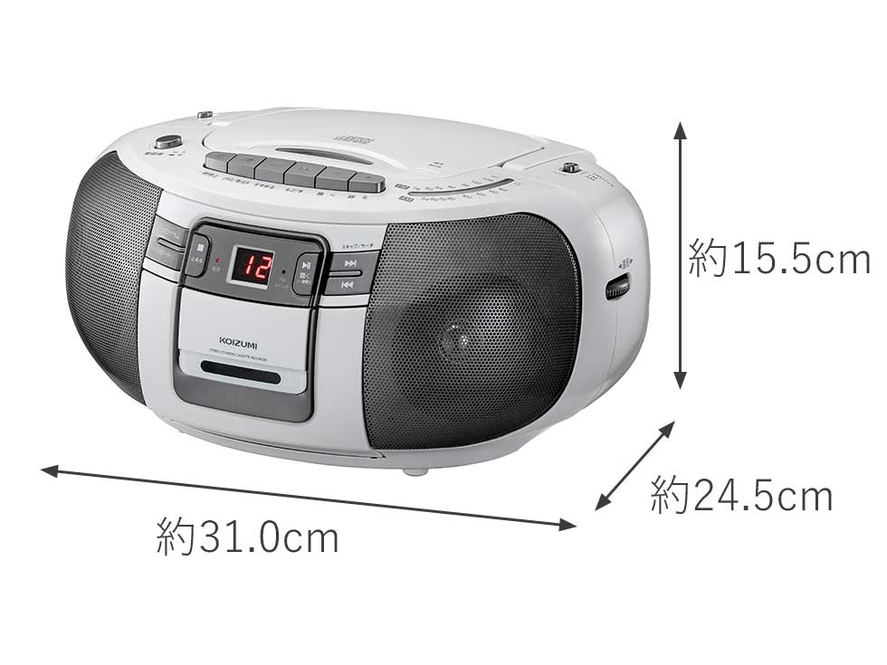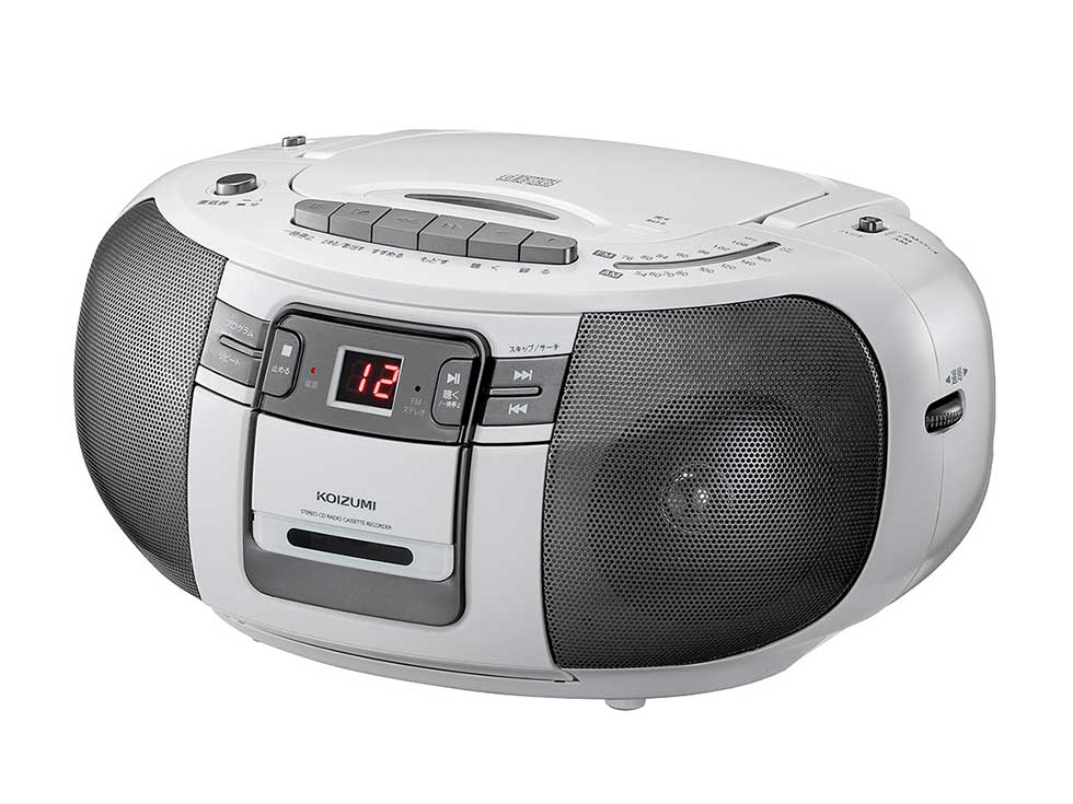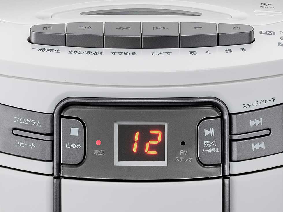 マイク端子、マイク付き、CD-R/-RW再生、プログラム20曲、リピート演奏、オートストップ、ラジオAM/FM、ワイドFM対応、内蔵マイク、外部入力