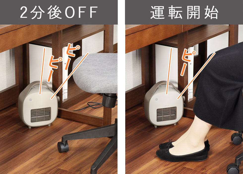 人がいなくなると約2分後に運転停止し、人の動きを感知すると運転再開します。