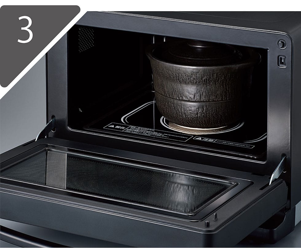 土鍋を庫内テーブル中央に置き、土鍋キーを押しダイヤルを回してメニュー番号を設定後、あたためスタートします