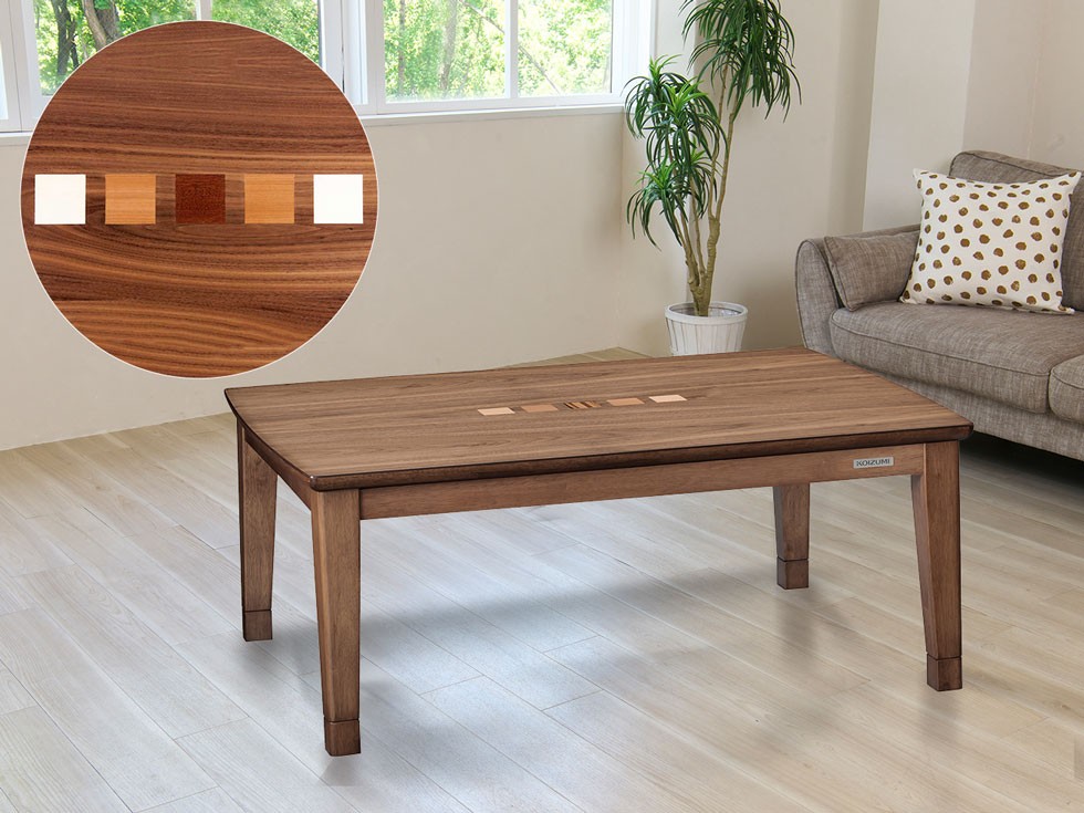 ウォールナット天板の中央に象嵌があり、インテリア性の高いテーブルこたつです。