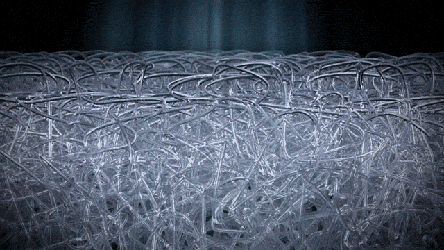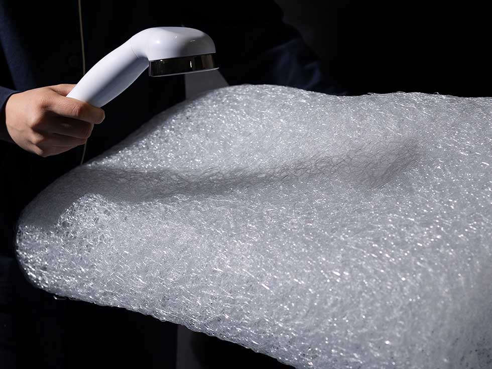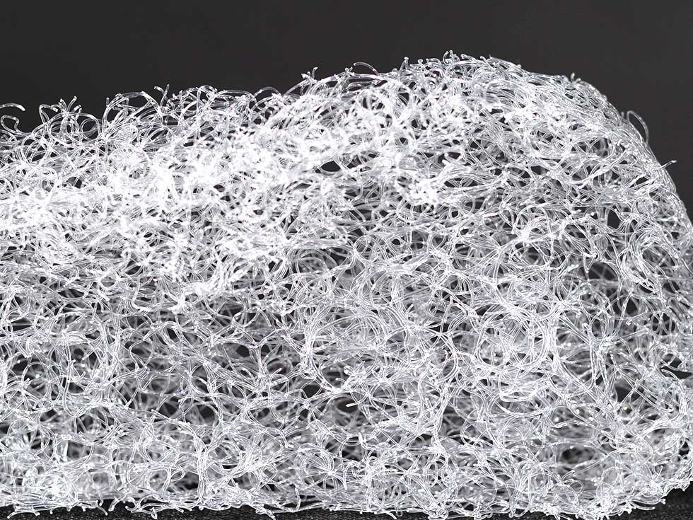 従来よりも細い直径0.5mmの超極細ファイバーが上下に絡み合うことによって圧力が多方向に拡散。