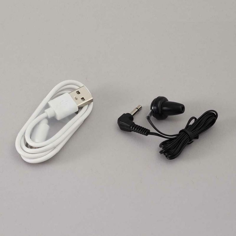 付属のUSBケーブルで充電できます。約2時間の充電で約8時間使用可能。