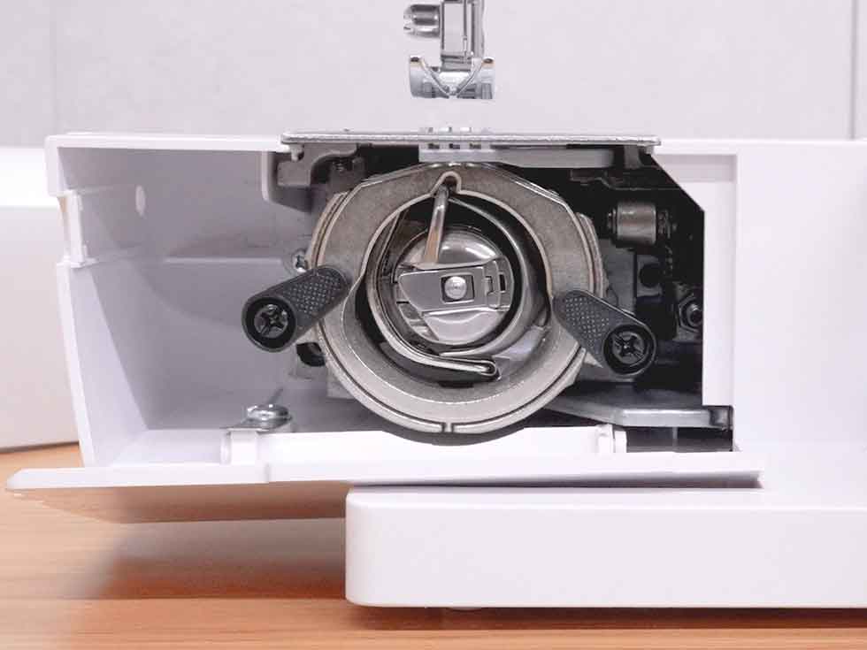 下糸の張り具合を調整できる垂直釜を採用しているため、