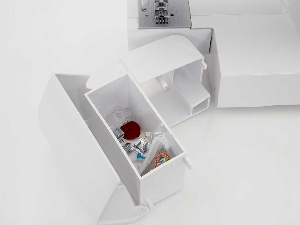 付属品 電源コード付きフットコントローラー、ボタンホール押え、ボタン付け押え、ファスナー押え、隠し縫い押え、ボビン(3個)、針(3本)、ブラシ付きシームリッパー、糸コマクッション、多用式ドライバー、ミシンカバー