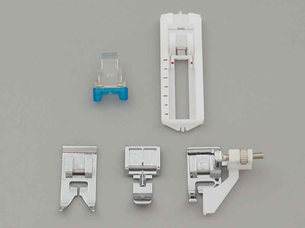 標準押え、ボタンホール押え、ボタン付け押え、ファスナー押え、かくし縫い押えが付属。